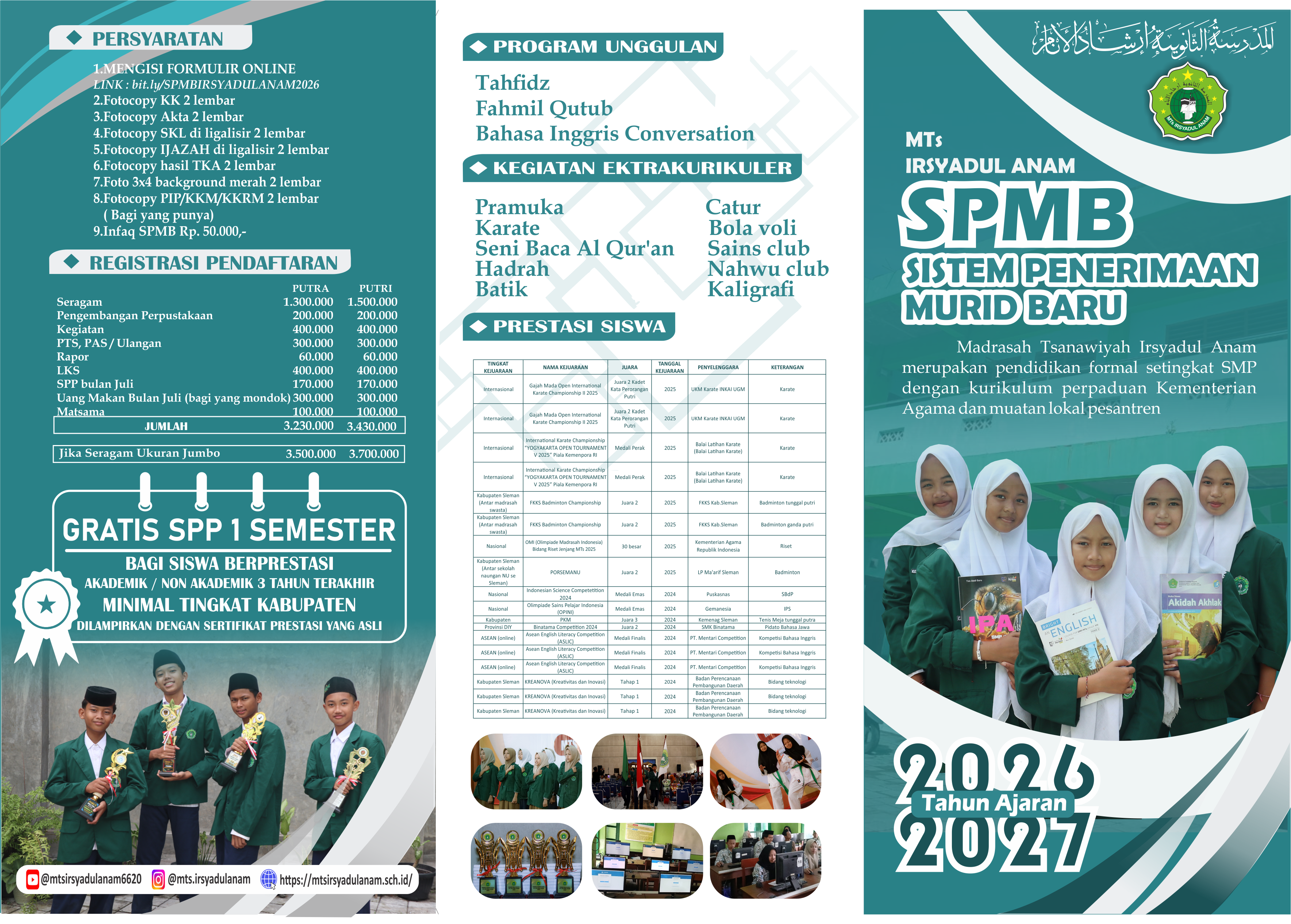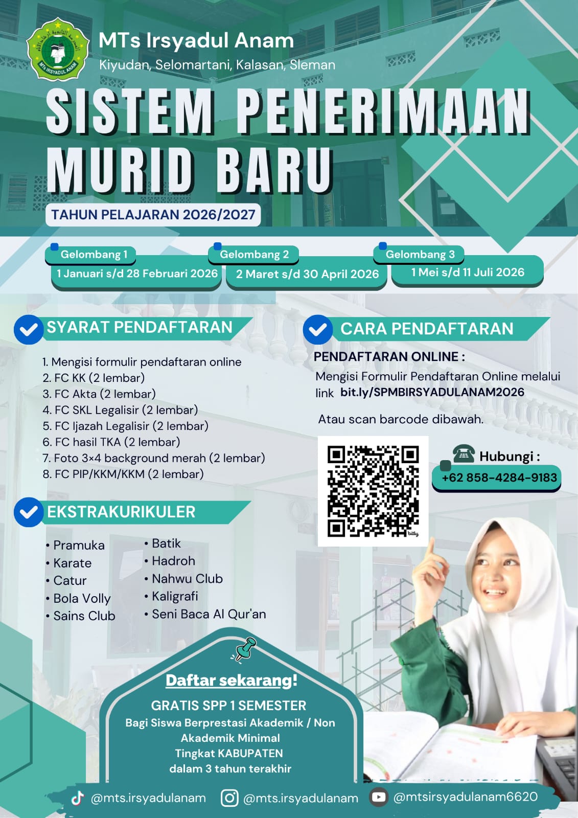 Kabar bahagia bagi para calon siswa/siswi MTs Irsyadul Anam! MTs Irsyadul Anam telah membuka kuota pendaftaran sebagnyak 120 siswa/siswi, memberikan peluang bagi putra-putri terbaik bangsa untuk bergabung dalam proses pembelajaran di tahun ajaran 2026/2027. Sistem Penerimaan murid Baru (Spmb) MTs Irsyadul Anam telah dibuka mulai tanggal 05 Januari 2026 sampai Kuota Pendaftaran terpenuhi